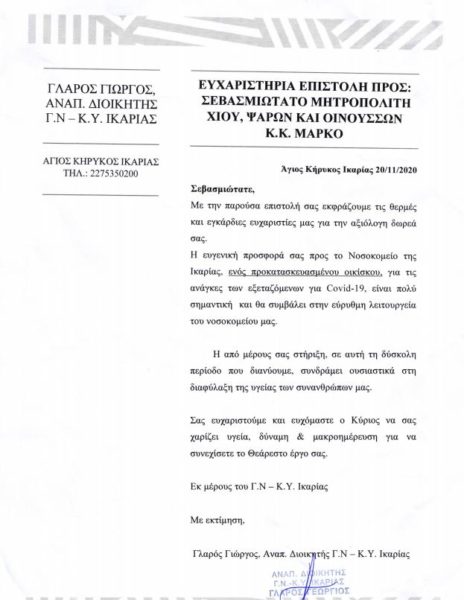 Δελτίο Τύπου εξέδωσε το Γενικό Νοσοκομείο Κ.Υ. Ικαρίας με το οποίο ευχαριστεί τον Σεβασμιώτατο Μητροπολίτη Χίου, Ψαρών και Οινουσσών κ. Μάρκο για την παραχώρηση ενός προκατασκευασμένου οικίσκου για τις ανάγκες του νοσοκομείου για τους εξεταζόμενους ασθενείς από κορωνοϊό, ενώ ο διοικητής του Νοσοκομείου απέστειλε ευχαριστήρια επιστολή στον Σεβασμιώτατο.