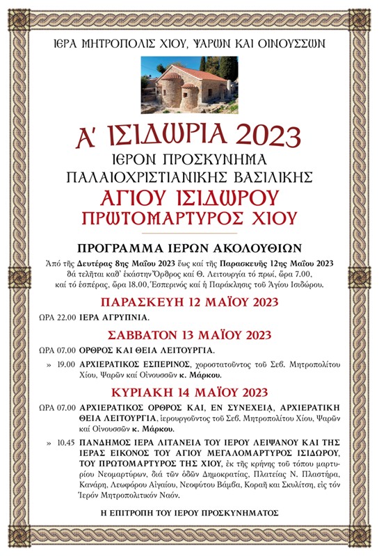 Η Χίος έχει την ιδιαίτερη ευλογία από φέτος να προσφέρει τη δέουσα τιμή στον Άγιο Μάρτυρα του Χριστού Ισίδωρο τον καλώς αθλήσαντα και στεφανωθέντα, επί μία εβδομάδα προ της κυριωνύμου ημέρας, με την τέλεση ιερών ακολουθιών, πρωί και απόγευμα, την προσκύνηση του ιερού λειψάνου του Αγίου, Αγρυπνία και Αρχιερατική Πανήγυρη, με τον γενικό τίτλο «Α΄ ΙΣΙΔΩΡΕΙΑ» και με επίκεντρο το Ιερό Προσκύνημα της Παλαιοχριστιανικής Βασιλικής του Αγίου Ισιδώρου.