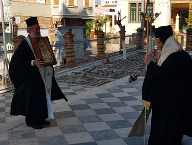 H Ιερά Εικόνα μεταφέρθηκε το πρωί της 10ης Νοεμβρίου στον Ιερό Μητροπολιτικό Ναό σύμφωνα με απόφαση του Σεβ. Μητροπολίτου Χίου, Ψαρών και Οινουσσών κ. Μάρκου, όπως στον εορτασμό της ιερής Μνήμης των Πολιούχων συμμετέχει και ιστορική εικόνα της Παναγίας, μεταφερόμενη στον Ιερό Μητροπολιτικό Ναό από τον Ιερό Ναό ή την Ιερά Μονή όπου φυλάσσεται. Η υποδοχή της Ιερής Εικόνας έγινε με εκκλησιαστική ιεροπρέπεια, προεξάρχοντος του Σεβ. Μητροπολίτου Χίου, Ψαρών και Οινουσσών κ. Μάρκου πλαισιωμένου από τους Αιδεσιμ. Πρωτοπρεσβύτερους: κ. Γεώργιο Πουλιά, Εφημέριο του Ι. Ναού Παναγίας Ερειθιανής Βροντάδου και κ. Ιωάννη Μουσά, Εφημέριο του Ι. Μητροπολιτικού Ναού Χίου, τηρουμένων των υγειονομικών μέτρων.