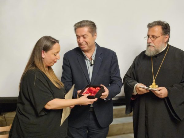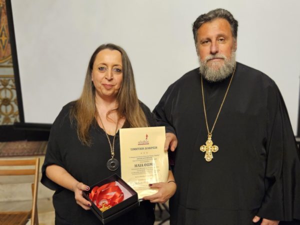 Ο Εφημέριος και υπεύθυνος του “Αληθώς”, Πρωτοπρεσβύτερος του Οικουμενικού Θρόνου Παναγιώτης Καποδίστριας, ομιλώντας για τον μακαριστό Τιμώμενο, θυμήθηκε ότι “η κηδεία του έγινε πανδήμως, ανήμερα των Φώτων του 2014, στον ίδιο αυτόν εδώ Ναό της Παναγούλας, μέσα σε συγκινησιακά φορτισμένη ατμόσφαιρα. Τότε, ενώ παρίστατο πενθηφορώντας πλήθος λαού, γνωστών και φίλων του, οι μαθητές του, με τα μουσικά όργανά τους, κύκλωσαν τη σορό του κι έπαιξαν τον σπαρακτικό “Εξαγνισμό” του Δημήτρη Λάγιου, αποχαιρετώντας έτσι τον αγαπημένο Δάσκαλό τους. Τώρα, η Ενορία του και το Μορφωτικό Κέντρο “Αληθώς”άξια και δίκαια -θεωρούμε- τον βραβεύει, απονέμοντάς του μετά θάνατον, Τιμητική Διάκριση με Χρυσό Σταυρό, τιμής και μνήμης ένεκεν”.
