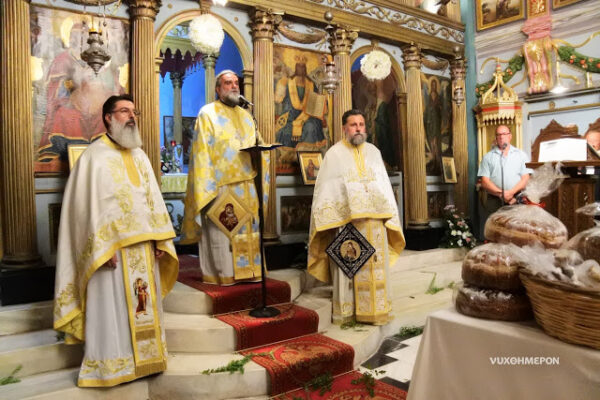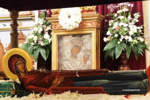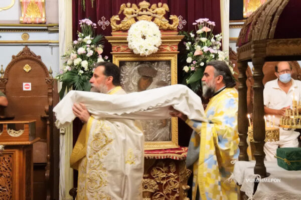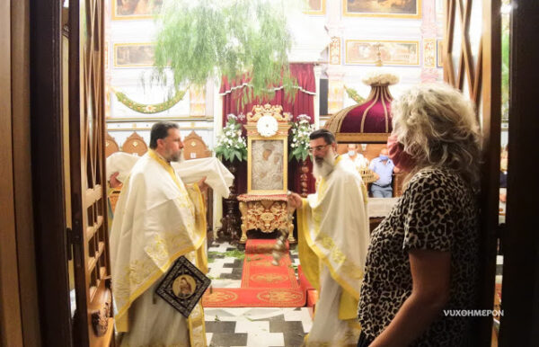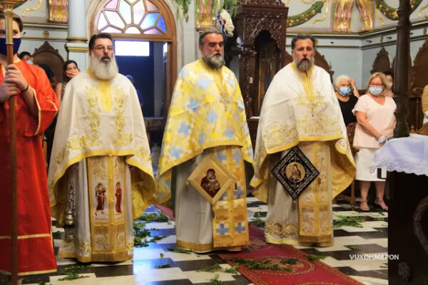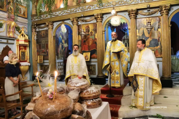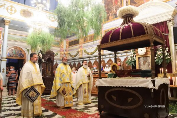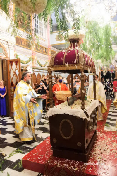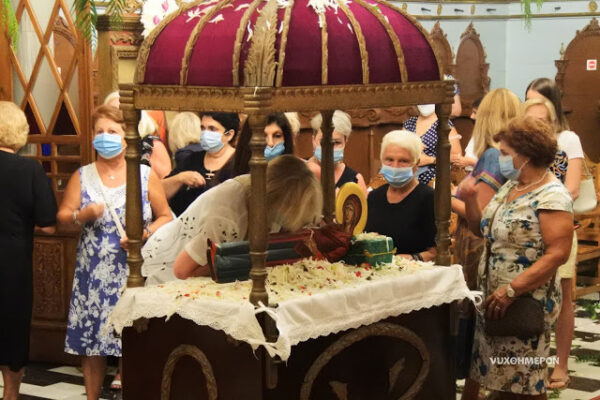 Άνθη και μύρα προσφέρθηκαν στον Επιτάφιο της Παναγίας και σκορπίστηκαν στον λαό. Κάηκαν ωραία πυροτεχνήματα, ενώ όλοι οι πανηγυριστές είχαν την ευκαιρία να ψωνίσουν τα πατροπαράδοτα πανηγυριώτικα κεράσματα: φιτούρες και παστέλια, αλληλοευχόμενοι “και του χρόνου καλύτερα, δίχως κορωνοϊό”.