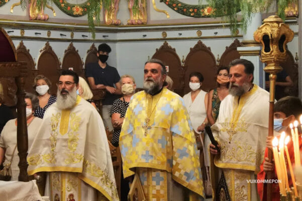 Τον οικείο Εφημέριο π. Παναγιώτη Καποδίστρια πλαισίωσαν μόνον ο Πρωτοπρεσβύτερος Χαράλαμπος Κυπριώτης και ο Πρεσβύτερος Ιωάννης Ρένεσης, υπακούοντας στις διατάξεις μη συνωστισμού. Άπαντες οι εκκλησιασθέντες εντός του Ναού (πλην ιερέων και ψαλτών) έφεραν μάσκες προφύλαξης και κάθονταν στις προβλεπόμενες αποστασιοποιημένες θέσεις, ενώ ευάριθμοι χωρίς μάσκα βρήκαν ετοιμασμένες θέσεις εκτός του Ναού.