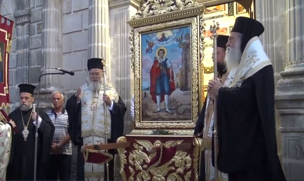 Αμέσως μετά πραγματοποιήθηκε η Λιτάνευση της Ιεράς Εικόνας του Αγίου Θεοφίλου και παρουσιάστηκε η επιχρυσωμένη καθέδρα του.