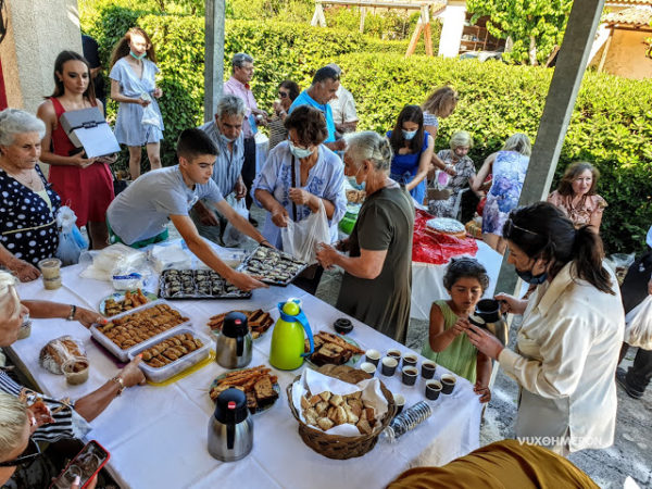 Μετά την πανηγυρική θεία Λειτουργία, στην ευσκιόφυλλη αυλή του Ναού, προσφέρθηκαν πλούσια κεράσματα, κυρίως δε ο πατροπαράδοτος “κουμπόστος”, ο οποίος έγινε -ως συνήθως- ανάρπαστος!