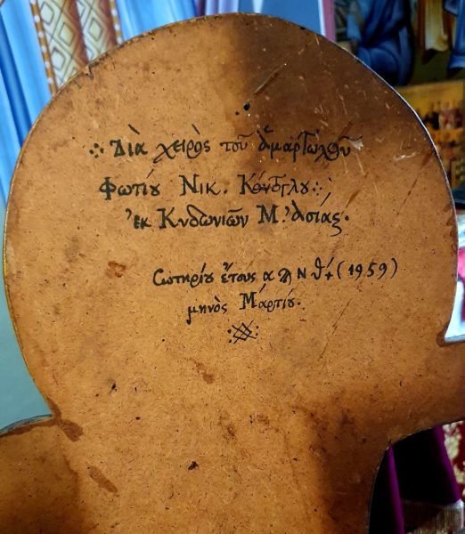Αυτό φαίνεται και από την ιδιαίτερη αφιερωματική επιγραφή του ιδίου, στο πίσω μέρος του Εσταυρωμένου, στο ύψος της κεφαλής και του φωτοστέφανου: «Δια χειρός του αμαρτωλού Φωτίου Νικ. Κόντογλου εκ Κυδωνιών Μ. Ασίας αϡ Ν θ + (1959) μηνός Μαρτίου».