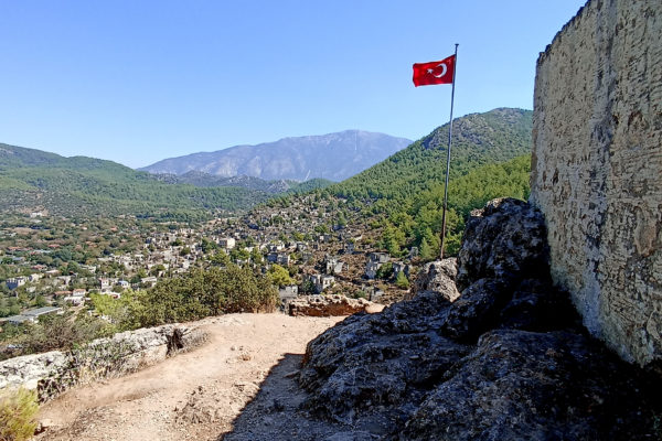 Ψηλά. Στο ερειπωμένο ξωκκλήσι. Με τον ιστό και την τουρκική σημαία. Σημάδι κυριαρχίας στο βράχο ή στα ερείπια άραγες;