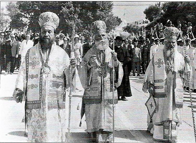 Τήνος – Δεκαπενταύγουστος 1964. Οι μακαριστοί Μητροπολίτες Χαλκίδος Γρηγόριος, Πρεβέζης Στυλιανός και Θήρας, Τοποτηρητής τότε Σύρου, Τήνου, Γαβριήλ, στη λιτανεία της Παναγίας.