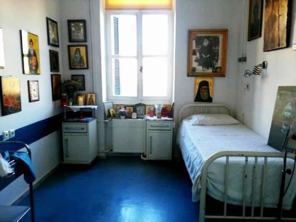 Έκαναν τις διατυπώσεις της εισόδου και παραμονής του στο θεραπευτήριο και η μία από τις δύο καλόγριες έφυγε. Στον θάλαμο που τον τοποθέτησαν ήταν άλλα τέσσερα κρεββάτια ωστόσο μόνο τα δύο ήταν πιασμένα. Στο διπλανό του γέροντα της Αίγινας αναπαυόταν ένας άντρας περίπου σαραντάρης που έπασχε από παράλυση των κάτω άκρων.