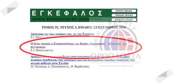 Πάντοτε, έχουμε κατά νου, το να μην κλέψει η λήθη τα διακεκριμένα κείμενα. Όπως αυτό του κ. Σταύρου Μπαλογιάννη, Ομοτίμου Καθηγητού Ιατρικής ΑΠΘ, στην Ιατρική Επιθεώρηση ΕΓΚΕΦΑΛΟΣ (2015), από όπου θα φωτίσουμε τα στοιχεία του κυρίου σώματος, αλλά και των υποσημειώσεων, τα οποία αφορούν την ιατρική διακονία του Αγίου Λουκά του Ιατρού και την ισόβια ορθοστασία ενός κορυφαίου σε παγκόσμιο επίπεδο χειρουργού, μέσα σε εκατομμύρια ώρες χειρουργικών επεμβάσεων.