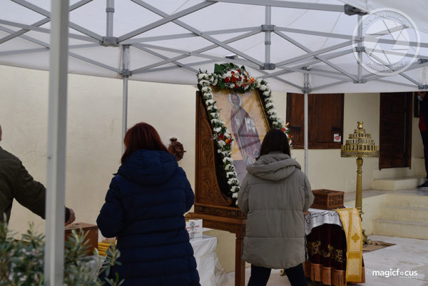 Η προσκύνηση της Ιεράς εικόνας του Αγίου, καθώς και αποτμήματος του αποθησαυρισμένου στον Ναό Ιερού λειψάνου του, πραγματοποιήθηκε στον προαύλιο χώρο του Ναού, όπου υπάρχει και μανουάλι από το οποίο οι πιστοί μπορούν να ανάψουν το κερί τους.