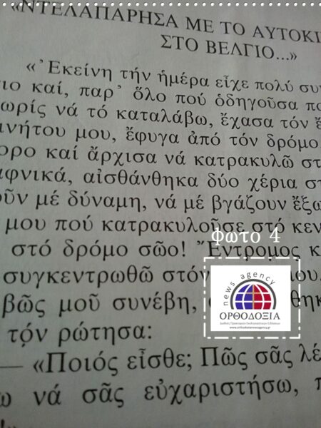 «Εκείνην την ημέρα είχε πολύ συννεφιά στο Βέλγιο και παρόλο που οδηγούσα πολύ προσεκτικά, χωρίς να καταλάβω, έχασα τον έλεγχο του αυτοκινήτου μου, έφυγα από τον δρόμο, πήρα τον κατήφορο και άρχισα να κατρακυλώ στο βάραθρο, όταν, ξαφνικά, αισθάνθηκα δυο χέρια στιβαρά να με τραβούν με δύναμη, να με βγάζουν έξω από το αυτοκίνητο μου που κατρακυλούσε στο κενό και να με ανεβάζει στον δρόμο σώο! Έντρομος και χωρίς να μπορώ να συγκεντρωθώ στον εαυτό μου, να καταλάβω τι ακριβώς μού συνέβη, απευθύνθηκα στον σωτήρα μου και τον ρώτησα: «Ποιος είσθε; Πως σας λένε; Που κάθεστε; Να έλθω να σας ευχαριστήσω, που μου σώσατε τη ζωή!». Και ο Άγιος Εφραίμ, γιατί αυτός ήταν ο σωτήρας μου, μόνον που δεν τον γνώριζα εκείνη τη στιγμή, μού απάντησε: «Εγώ μένω στη Νέα Μάκρη!».