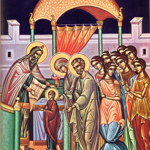 Πίσω τους βλέπουμε πολλές νεάνιδες, να κρατούν λαμπάδες αναμμένες και να προτρέπουν την Παναγία οδηγώντας την στο Ιερό, όπου έμεινε σαν περιστερά ηγιασμένη και έγινε η λαμπάδα του Θεού, η κατοικία Του, ο ναός Του, Το θυσιαστήριο και η λατρεία η ζώσα και καθαρά.
