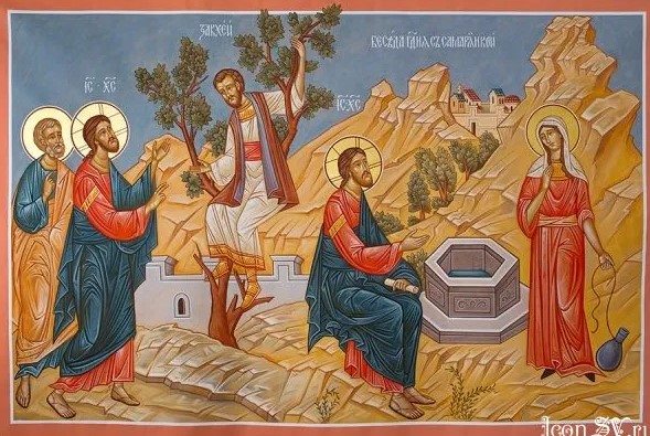 Εκείνο τον καιρό, έφτασε ο Κύριος σε μια πόλη της Σαμάρειας που λεγόταν Συχάρ, κοντά στο χωράφι που είχε δώσει ο Ιακώβ στο γιο του τον Ιωσήφ. Εκεί βρισκόταν το πηγάδι του Ιακώβ. Ο Ιησούς, κουρασμένος από την πεζοπορία, κάθισε κοντά στο πηγάδι· ήταν γύρω στο μεσημέρι. Έρχεται τότε μια γυναίκα από τη Σαμάρεια να βγάλει νερό.