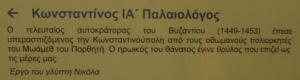Παραθέτουμε φωτογραφία από τον ανδριάντα του Κωνσταντίνου Παλαιολόγου στο Εθνικό και Ιστορικό Μουσείο της Αθήνας. Από τη μόνιμη Συλλογή του Μουσείου.