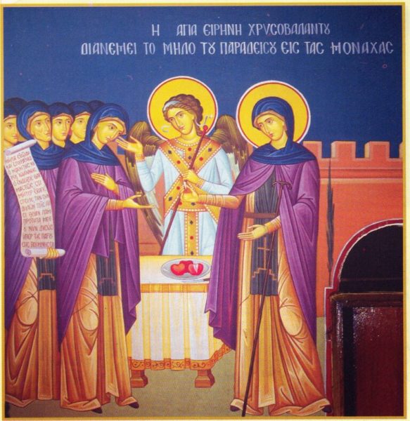 – Χαίρε Ειρήνη, δούλη του Χριστού αγαπημένη. Πάρε αυτά τα 3 μήλα του Παραδείσου, για να τα έχεις παρηγοριά στη γη, μέχρι να αναχωρήσεις απ’ αυτή. Έτσι πρόσταξε ο Κύριος.