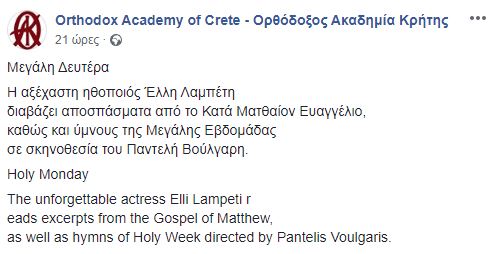 Η Έλλη Λαμπέτη διαβάζει Ύμνους της Μεγάλης Εβδομάδος (ΒΙΝΤΕΟ)
