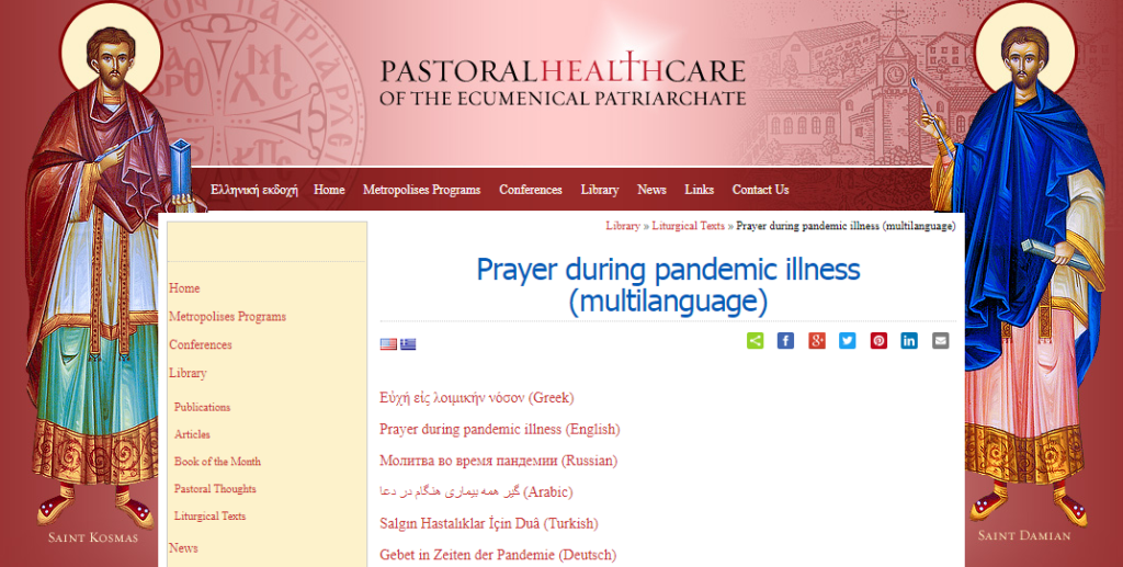 Είναι η Ευχή που το Πατριαρχικό Δίκτυο του Οικουμενικού Πατριαρχείου για την Ποιμαντική Διακονία στον Χώρο της Υγείας εξέδωσε για την πανδημία. Αξιοσημείωτο είναι ότι έχει μεταφραστεί σε πολλές γλώσσες.