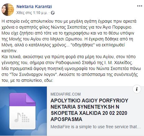 “Η ιστορία ενός απολυτικίου” αναφέρει η Υμνωδός κα Νεκταρία Καραντζή σε επίκαιρη ανάρτησή της, “που με μεγάλη αγάπη έγραψε πριν αρκετά χρόνια ο αγαπητός φίλος Νώντας Σκοπετέας για τον Άγιο Πορφυριο”.