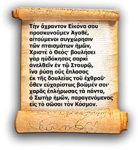 Την άχραντον εικόνα σου προσκυνούμεν αγαθέ, Αιτούμενοι συγχώρεσιν των πταισμάτων ημών βουλήσει γαρ ηυδόκησας ανελθείν εν τω Σταυρώ ίνα ρύση ους έπλασες εκ της δουλείας του εχθρού όθεν ευχαρίστως βοώμεν χαράς επλήρωσας τα πάντα ο σωτήρ ημών ο παραγενόμενος εις το σώσαι τον κόσμον.