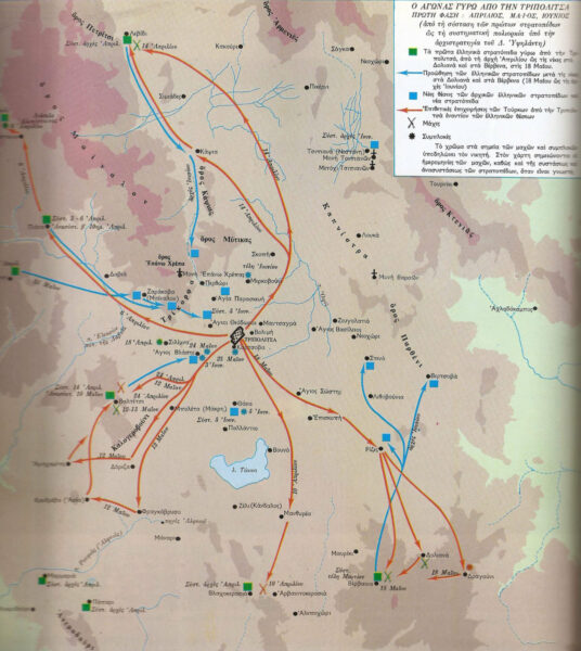 Οι Έλληνες επαναστάτες, υπό τον Νικηταρά, νικούν τους Οθωμανούς Τούρκους στα Δολιανά της Αρκαδίας στις 18 Μαΐου 1821 και επισφραγίζουν τη μεγάλη νίκη στο Βαλτέτσι (12-13 Μαΐου). Ο κλοιός γύρω από την Τριπολιτσά σφίγγει, σύμφωνα με το στρατηγικό σχέδιο του Θεόδωρου Κολοκοτρώνη.