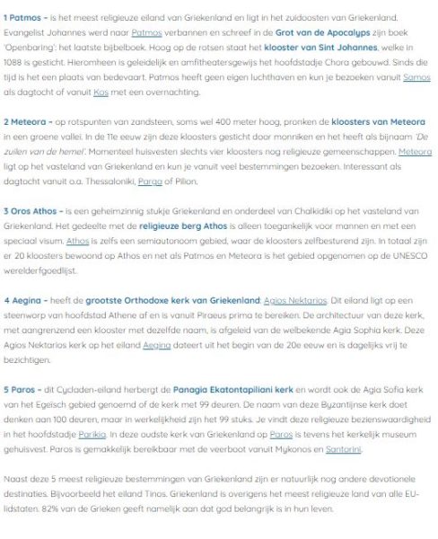 Πρόσφατα δημοσιεύματα από ολλανδικά ΜΜΕ κατέγραψαν τους ελληνικούς προορισμούς που είναι ελκυστικοί για επίσκεψη εφέτος. Ξεχωρίζει η λίστα με τους πέντε προτεινόμενους προορισμούς της Ελλάδας για θρησκευτικό τουρισμό, σύμφωνα με το Griekenland.net, «τουριστική πηγή» της Ολλανδίας αποκλειστικά για ταξίδια στην Ελλάδα.