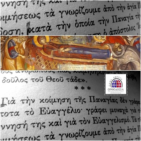 «Για την Κοίμηση της Παναγίας δε γράφει τίποτα το Ευαγγέλιο. Γράφει μονάχα για τη Γέννησή της και για τον Ευαγγελισμό. Τα της Κοιμήσεως τα γνωρίζουμε από την αγία Παράδοση».