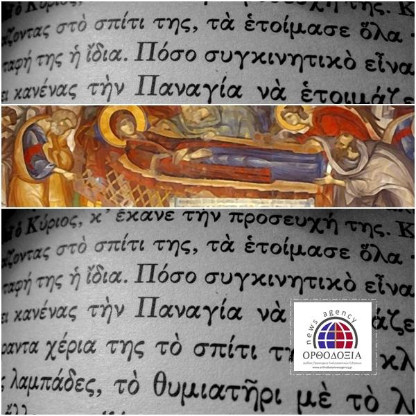 «Λοιπόν, αφού ετοιμάσθηκε η Παναγία, ξάπλωσε στην κλίνη της, ευτρέπισε τα ρούχα της, σταύρωσε τα άχραντα χέρια της απάνω στο στήθος της, και περίμενε τον Γυιό της να πάρει την ψυχή της».