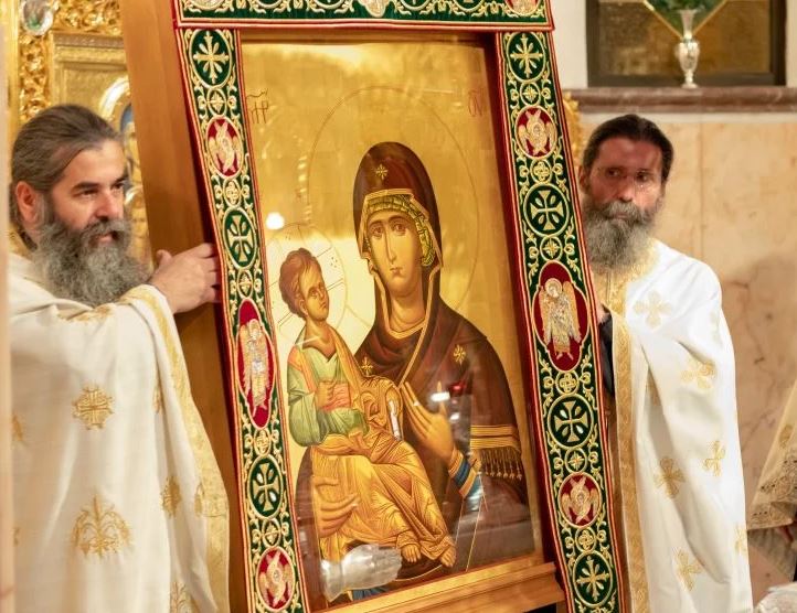 Και πράγματι, κατά θαυματουργικό τρόπο, το ήσυχο αυτό ζώο διέσχισε όλη τη Σερβία, την Ελληνική περιοχή της Μακεδονίας και ήρθε στο Άγιον Όρος, στην Ιερά Μονή Χιλανδαρίου, όπου οι μοναχοί την υποδέχθηκαν με τιμές και λιτανείες. Το ευλογημένο αυτό γαϊδουράκι, σύμφωνα με την ιερή παράδοση, μόλις τοποθετήθηκε η Εικόνα στο Ιερό του Μοναστηριού, έπεσε νεκρό.