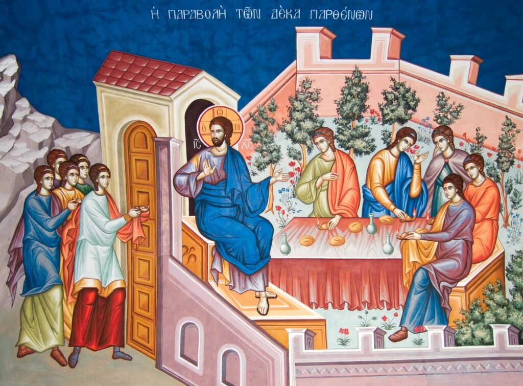 Την παραβολή των δέκα Παρθένων διασώζει ο ευαγγελιστής Ματθαίος στο 25ο κεφάλαιο του Ευαγγελίου του. Με την ευκαιρία μιας καταπληκτικής εσχατολογικής ομιλίας Του ο Κύριος είπε και την εξής παραβολή: Η Βασιλεία των ουρανών μοιάζει με δέκα παρθένες οι οποίες αφού πήραν μαζί τους τα λυχνάρια τους πήγαν να υποδεχθούν τον νυμφίο. Πέντε από αυτές ήταν σώφρονες και φρόντισαν να έχουν μαζί τους απόθεμα λαδιού για τα λυχνάρια τους, ενώ οι άλλες πέντε ήταν ανόητες και δεν φρόντισαν να έχουν μαζί τους το αναγκαίο απόθεμα λαδιού. Επειδή δε αργούσε ο νυμφίος και η νύχτα προχωρούσε έπεσαν να κοιμηθούν. Τα μεσάνυχτα ακούστηκε μια γοερή κραυγή η οποία ανήγγειλε τον ερχομό του νυμφίου. Οι παρθένες σηκώθηκαν για να προαπαντήσουν τον νυμφίο. Οι μεν σώφρονες παρθένες που είχαν απόθεμα λαδιού άναψαν τα λυχνάρια τους, οι δε μωρές ζητούσαν απεγνωσμένα από τις σώφρονες να τους δώσουν λίγο λάδι. Εκείνες τους απάντησαν πως μόλις αρκεί για τα δικά τους τα λυχνάρια και καλά θα κάνουν να πάνε να αγοράσουν. Οι ανόητες παρθένες έτρεξαν να αγοράσουν λάδι, αλλά εν τω μεταξύ ο νυμφίος έφθασε και μπήκε στο χώρο του γάμου με τις πέντε φρόνιμες και έκλεισε την πόρτα. Οι ανόητες παρθένες έφθασαν μετά και άρχισαν να φωνάζουν Κύριε, Κύριε άνοιξέ μας. Αυτός τους απάντησε αλήθεια σας λέγω πως δεν σας γνωρίζω και έμειναν τελικά έξω του νυμφώνος. Κλείνει την παραστατική αυτή παραβολή του ο Κύριος με την εξής σωτήρια προτροπή: «Γρηγορείτε ουν, ότι ουκ οίδατε την ημέραν ουδε την ώραν εν η ο Υιός του ανθρώπου έρχεται» (Ματθ.κε΄13 ) και «γρηγορείτε ουν΄ ουκ οίδατε γαρ πότε ο κύριος της οικίας έρχεται, οψέ ή μεσονυκτίου ή αλεκτροφωνίας ή πρωί΄ μη ελθών εξαίφνης εύρη υμάς καδεύδοντας»(Μάρκ.13:35).