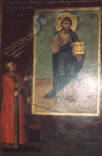 Ο ντυμένος με την κόκκινη ενδυμασία είναι έλληνας (χριστιανός) ο οποίος είχε πάρει δάνειο από κάποιον εβραίο και ενώ του το εξώφλησε, ο εβραίος δεν παραδεχόταν και λέει ότι δεν πήρε τίποτα. Οι διαφωνούντες μιλούν μπροστά στην εικόνα και ο χριστιανός λέει προς τον Χριστό: «Κύριε Ιησού Χριστέ, όπου εγγυήθης εσύ, επήρε το χρέος τούτος ο εβραίος». Ενώ από τον Κύριο σαν λάμψη ακούγετε: «ναι τα επήρε», ενώ ο εβραίος (που δυστυχώς ο αγαπητός αδελφός δεν τον έχει φωτογραφήσει) γονατιστός και φοβισμένος απαντά: «ναι Κύριε τα πήρα μην με τιμωρήσεις».