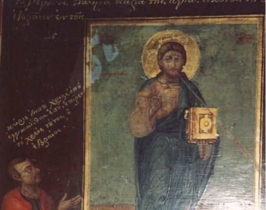 Ο ντυμένος με την κόκκινη ενδυμασία είναι έλληνας (χριστιανός) ο οποίος είχε πάρει δάνειο από κάποιον εβραίο και ενώ του το εξώφλησε, ο εβραίος δεν παραδεχόταν και λέει ότι δεν πήρε τίποτα. Οι διαφωνούντες μιλούν μπροστά στην εικόνα και ο χριστιανός λέει προς τον Χριστό: «Κύριε Ιησού Χριστέ, όπου εγγυήθης εσύ, επήρε το χρέος τούτος ο εβραίος». Ενώ από τον Κύριο σαν λάμψη ακούγετε: «ναι τα επήρε», ενώ ο εβραίος (που δυστυχώς ο αγαπητός αδελφός δεν τον έχει φωτογραφήσει) γονατιστός και φοβισμένος απαντά: «ναι Κύριε τα πήρα μην με τιμωρήσεις».