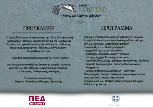 Την Τετάρτη 17 Απριλίου 2019 στις 19:30 στην αίθουσα “Αρχιεπίσκοπος Σπυρίδων” της Ζωσιμαίας Παιδαγωγικής Ακαδημίας θα πραγματοποιηθεί η παρουσίαση βιβλίου με τίτλο: Κόνιτσα-Στα αγιασμένα αχνάρια του Αγίου Παϊσίου της Σταματίας Καραγεωργίου-Πάπιστα οικονομολόγου-συγγραφέως.