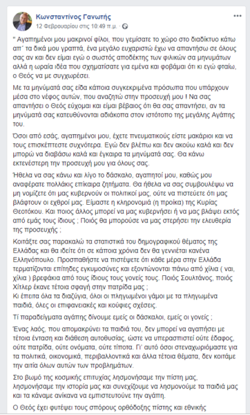 Το προφίλ και τη σελίδα του κύριου Κωνσταντίνου Γανωτή στο κοινωνικό δίκτυο Facebook διαχειρίζονται από συγγενικό του πρόσωπο και πάντα σε συνεννόηση με τον ίδιο.