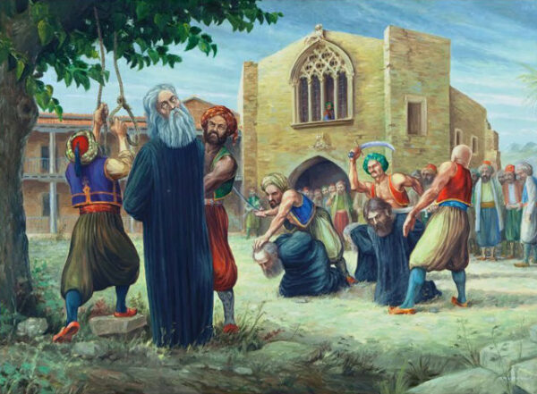 Στις 9 Ιουλίου 1821, ο αρχιεπίσκοπος Κύπρου Κυπριανός απαγχονίστηκε στην πλατεία Διοικητηρίου της Λευκωσίας κάτω από μία μουριά, ενώ την ίδια ημέρα καρατομήθηκαν οι τρεις μητροπολίτες της Κύπρου, ο Πάφου Χρύσανθος, ο Κιτίου Μελέτιος και ο Κυρηνίας Λαυρέντιος, καθώς και άλλοι κληρικοί. Την επομένη και ως τις 14 Ιουνίου αποκεφαλίστηκαν και οι υπόλοιποι του καταλόγου, εκτός από 36 που αλλαξοπίστησαν.