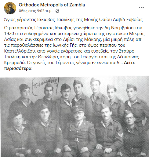 Σε ανάρτηση προς τιμήν της εορτίου μνήμης του Αγίου Ιακώβου του Τσαλίκη (22 Νοεμβρίου) προχώρησε η Ιερά Μητρόπολη Ζάμπιας, αναδημοσιεύοντας παλαιές φωτογραφίες του Αγίου. Μεταξύ άλλων, το ιστορικό φωτογραφικό ντοκουμέντο με τον Άγιο Ιάκωβο Τσαλίκη στρατιώτη το έτος 1949 με τον Συνταγματάρχη Πολύκαρπο Ζώη και συναδέλφους του.
