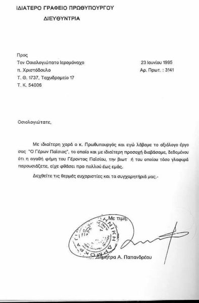 Ο Ανδρέας Παπανδρέου δια μέσου του Ιδιαιτέρου Γραφείου του αποστέλλει ευχαριστιακή απάντηση στον βιογράφο του Αγίου, Ιερομόναχο Χριστόδουλο, για την αποστολή του πονήματος του, στις 23 Ιανουαρίου 1995: “Με ιδιαίτερη χαρά ο κ. Πρωθυπουργός και εγώ λάβαμε το αξιόλογο έργο σας “Ο Γέρων Παΐσιος”, το οποίο με ιδιαίτερη προσοχή διαβάσαμε, δεδομένου ότι η αγαθή φήμη του Γέροντος Παΐσιου, την βιωτή του οποίου τόσο γλαφυρά παρουσιάζετε, είχε φτάσει προ πολλού έως εμάς. Δεχθείτε τις θερμές ευχαριστίες και τα συγχαρητήρια μας”. Το ιστορικό ντοκουμέντο φέρνει στη δημοσιότητα την ημέρα της εορτίου μνήμης του Αγίου, ο Αρχιμ. π. Τιμόθεος Ηλιάκης σε επίκαιρη ανάρτησή του.
