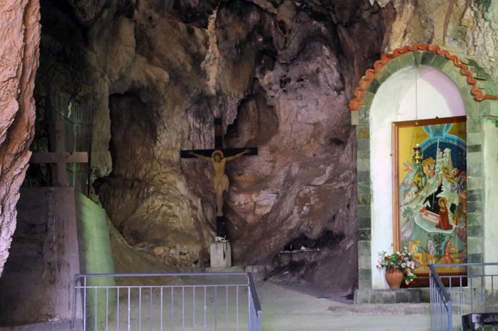 Το πρώτο είναι ότι βρίσκεται σε μια περιοχή που το πράσινο και τα νερά του ιστορικού ποταμού Ερασίνου την κάνουν μαγευτική. Το δεύτερο είναι ότι ο ναός είναι χτισμένος μέσα σε ένα σπήλαιο του όρους Χάον.