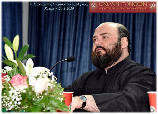 Ο π. Χαράλαμπος Παπαδόπουλος, αφού ευχαρίστησε τη Σχολή Γονέων και τον Πρόεδρό της, για την τιμητική πρόσκληση, όπως είπε, προς αυτόν, ξεκίνησε την ομιλία του και μεταξύ πολλών άλλων, με τη χαρακτηριστική ευφράδεια λόγου που τον διακρίνει, είπε και τα εξής: