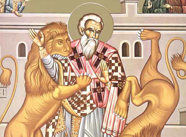 “Εσύ που πληγώθηκες στην καρδιά από την τέλεια αγάπη, όταν ο έρωτας που κατακαίει τα πάντα έκανε την ψυχή σου να φλέγεται, ιερώτατε πάτερ, για να πορευτείς προς τον Δεσπότη Χριστό κατεπειγόντως (γρήγορα -γρήγορα), τότε φώναξες τον λόγο που έμεινε στην ιστορία: υπάρχω ως σιτάρι του Δημιουργού μου και πρέπει να αλεσθώ από τα δόντια των θηρίων με κάθε τρόπο, για να φανώ καθαρότατος άρτος του Λόγου και Θεού μου φανώ. Αυτόν ικέτευε να σώσει και να φωτίσει τις ψυχές μας”
