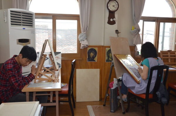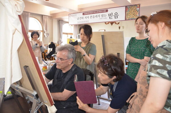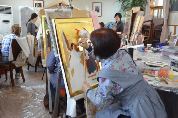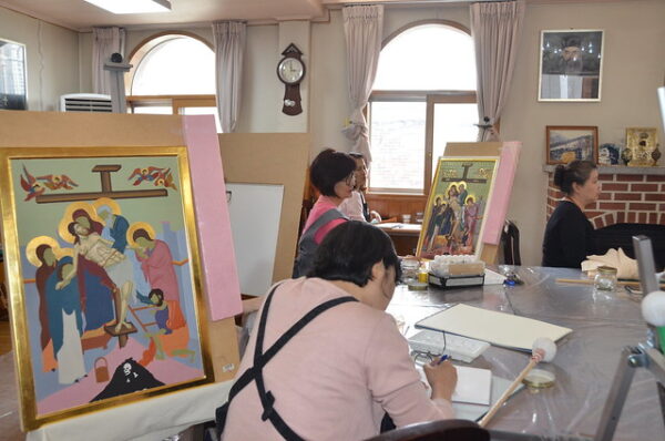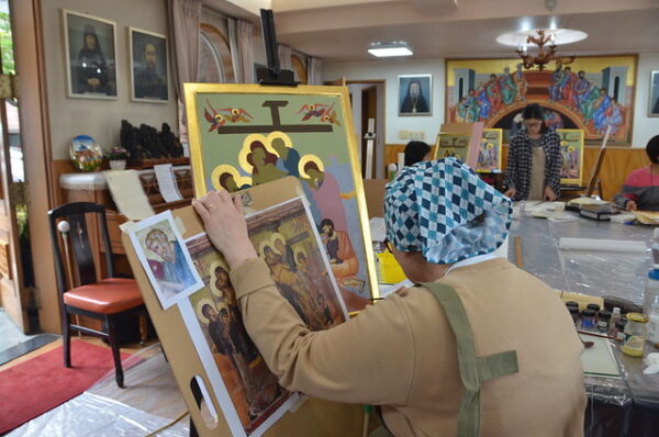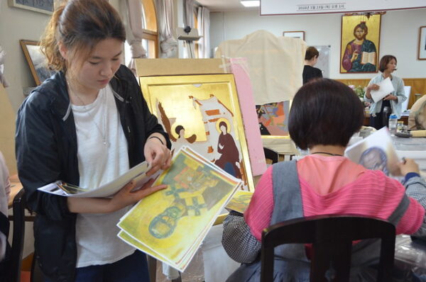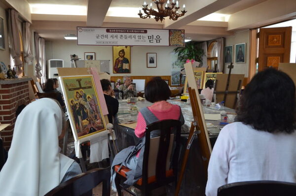 Με μεγάλη προσέλευση και επιτυχία συνεχίζονται τα μαθήματα αγιογραφίας στον χώρο της Ιεράς Μητροπόλεως Κορέας στην Σεούλ. Ο καθηγητής – αγιογράφος κ. Σώζος Γιαννούδης ήρθε στην Κορέα και φέτος για να διδάξει την ιερή τέχνη της αγιογραφίας σε Κορεάτες.