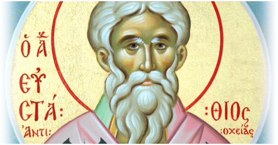 Θείας ἔμπλεως σοφίας πέλων, ὁμοούσιον Πατρὶ τὸν Λόγον ἐν τῇ συνόδῳ τῇ πρώτῃ ἐκήρυξας, καὶ διωγμοῖς ὁμιλήσας καὶ θλίψεσιν δόξης ἀρρήτου μετέσχες, Εὐστάθιε. Πάτερ ὅσιε Χριστὸν τὸν Θεὸν ἱκέτευε δωρίσασθαι ἡμῖν τὸ μέγα ἔλεος.