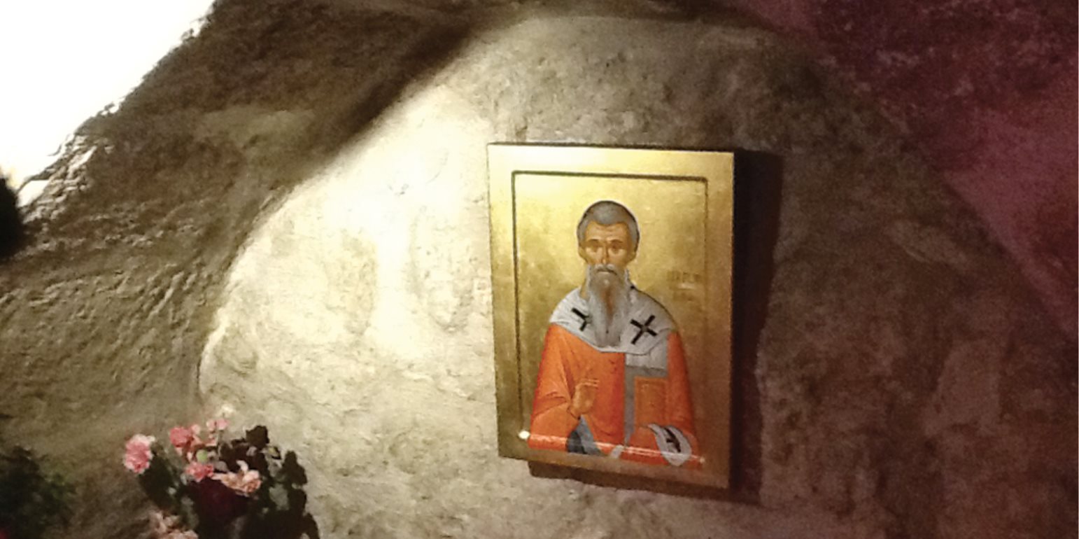Σ’ένα βαθούλωμα του βράχου βρίσκεται η εικόνα του Αγίου και μπροστά της υπάρχει αναμμένο πάντα το καντήλι.