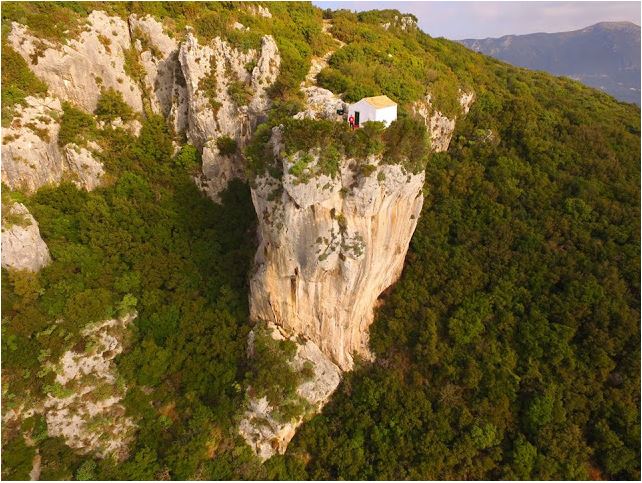 Στέκει σιωπηλό και έρημο απολαμβάνοντας την θέα των δυτικών ακτών και του λιβαδιού του Ρόπα που ανοίγεται διάπλατα μπροστά του. Κοιτώντας το από κάτω και μακριά με λίγη φαντασία θα μπορούσαμε να το πούμε μια μικρογραφία (εντάξει με πολύ φαντασία) των Μετέωρων.