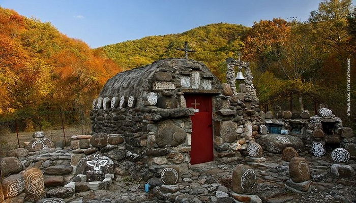 Ένα ξωκλήσι σαν από παραμύθι φτιαγμένο από ποταμίσιες πέτρες, κάποιες χαραγμένες με το καλέμι, άλλες ζωγραφισμένες σε κάδρα και μια ταμπέλα: «Παρακαλώ μην αφήνετε χρήματα».
