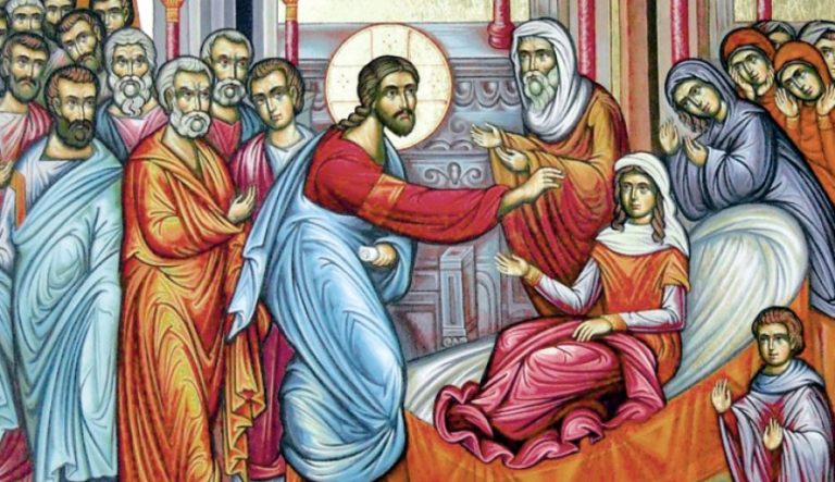 Την προηγούμενη Κυριακή ακούσαμε για τη θεραπεία του δαιμονιζομένου νέου στη χώρα των Γεργεσηνών, όπου οι κάτοικοι εκεί βλέποντας το θαύμα αυτό, παρεκάλεσαν τον Ιησού Χριστό να φύγει από τα όρια της περιοχής τους. Φεύγοντας ο Ιησούς Χριστός από την περιοχή των Γεργεσηνών φτάνει στην Καπερναούμ, όπου γίνεται δεκτός με θέρμη και χαρά από τους κατοίκους οι οποίοι σχημάτισαν μια λαοθάλασσα για να τον υποδεχθούν. Μεταξύ όλων αυτών των ανθρώπων που ανέμεναν τον Ιησού, βρίσκονταν και άνθρωποι οι οποίοι κατείχαν μια εξέχουσα κοινωνική θέση ανάμεσα στην πόλη της Καπερναούμ, όπως ο αρχισυνάγωγος Ιάειρος. Μπορούμε να δούμε εδώ αλλά και σε άλλες ευαγγελικές περικοπές ότι η διδασκαλία και τα θαυματα που επιτελούσε ο Χριστός δεν απευθύνονταν μόνο στον απλό λαό και τους φτωχούς, όπως πολλοί πιστεύουν, αλλά απευθύνονταν σε όλες τις βαθμίδες των ανθρώπων της κοινωνίας. Εδώ όμως η περικοπή εστιάζεται στον αρχισυνάγωγο Ιάειρο ο οποίος ζητά από τον Χριστό να θεραπεύσει την μοναχοκόρη του, που ήταν βαριά άρρωστη. Ο Ιάειρος έχοντας καλή διάθεση στην ψυχή του και ακούγοντας ίσως για τον Ιησού Χριστό και τα θαύματα που πραγματοποιούσε, αψηφά τους Γραμματείς και Φαρισαίους που επέκριναν το Χριστό και προσέρχεται προς αυτόν για να τον παρακαλέσει να πάει στο σπίτι του για να θεραπεύσει την ετοιμοθάνατη μοναχοκόρη του. Ευρισκόμενος ο Χριστος στο δρόμο προς το σπίτι του Ιάειρου πραγματοποιείται ένα άλλο θαύμα, αυτό της θεραπείας της αιμοροούσης γυναικός. Η γυναίκα αυτή βρισκόταν μεταξύ του κόσμου που μαζεύτηκε στην Καπερναούμ και ακολουθούσε το Χριστό, έχοντας στο νού της ένα συγκεκριμένο σκοπό, αυτό της θεραπείας της απο την ασθένεια που την ταλαιπωρούσε. Προηγουμένως για δώδεκα ολόκληρα χρόνια υπέφερε απο αιμοραγία χωρίς να καταφέρνει να θεραπευτεί, παρ’ όλα τα φάρμακα που της έδιναν διάφοροι γιατροί τους οποίους είχε επισκευθεί. Ακούγοντας λοιπόν για τον ερχομό του Χριστού, αναπτέρωσε τις ελπίδες της και έχοντας μια βεβαιότητα οτι αυτός μόνο μπορούσε να την θεραπευσεί, πηγαίνει προς αυτόν. Η ασθένεια της αιμορραγίας βάση των θρησκευτικών αντιλήψεων των Εβραίων καθιστούσε μια γυναίκα «μολυσμένη». Έτσι εκτός από την σωματική ασθένεια που ταλαιπωρούσε μια γυναίκα, είχε να αντιμετωπίσει και την περιθωριοποίηση που υφίστατο από την κοινωνία. Παρ’ όλα αυτά όμως, η γυναίκα αυτή παίρνει την απόφαση να πλησιάσει τον Χριστό. Έτσι προσπαθώντας να μην γίνει αντιληπτή, εισχωρεί μέσα στο πλήθος με σκοπό να καταφέρει να έρθει και να αγγίξει τον Χριστό. Η πίστη αυτή που είχε οτι φτάνει και μόνο να αγγίξει τον Χριστό για να θεραπεύτει τις φέρνει τελικά αυτό που ποθούσε την ιάση. Με το που άγγιξε το Χριστό θεραπεύθηκε αμέσως.