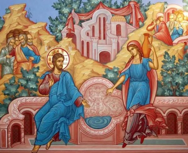 Ο Χριστός κάθεται στο πηγάδι του Ιακώβ και συζητεί με τη Σαμαρείτιδα, την άγνωστη, τη στιγματισμένη και ανώνυμη μέχρι τότε εκείνη γυναίκα. Της ζητά νερό. Ο Κύριος ζητά από όλους μας κάποιες κινήσεις, ενέργειες. Ζητά την προσφορά της δικής μας αγάπης για να αποτολμήσουμε την έξοδο από το εγώ και τον ατομικισμό μας.