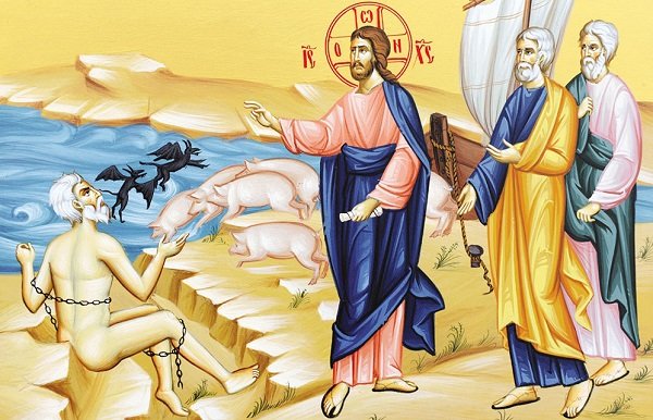 Το σημερινό ευαγγελικό ανάγνωσμα προέρχεται από το 8ο κεφάλαιο του κατά Λουκά ιερού Ευαγγελίου και διηγείται τη θαυμαστή θεραπεία των δαιμονιζομένων στην πόλη των Γεργεσηνών. Το περιστατικό αυτό, τοποθετείται χρονικά, αμέσως μετά το θαύμα του χορτασμού των πεντακισχιλίων και της καταπαύσεως των υδάτων. Ο Κύριος λοιπόν, μαζί με τους μαθητές του κατέπλευσε με πλοιάριο απέναντι από τη Γαλιλαία, ανατολικά, στην περιοχή των Γεργεσηνών. Τα Γέργεσα ή Γάδαρα ήταν πόλη της δεκαπόλεως της Παλαιστίνης. Η ζωή των ανθρώπων ήταν απρόσεχτη, αφού έκτρεφαν χοίρους πράγμα που σύμφωνα με το Μωσαϊκό νόμο απαγορευόταν. Μόλις λοιπόν ο Χριστός, βγήκε από το πλοίο, αρκετά καλά έξω από την πόλη, βρέθηκε σ’ ένα φρικώδες θέαμα. Είδε να βγαίνουν μέσα από το κοιμητήριο της περιοχής εκείνης δύο δαιμονιζόμενοι. Η παρουσία και μόνο του Κυρίου, χωρίς ακόμα να μιλήσει καθόλου ο ίδιος στους πάσχοντες, κατετρόμαξε τα δαιμόνια τα οποία τους είχαν κυριεύσει για τα καλά. Έτσι και αυτός ακόμα ο πιο άγριος και απειλητικός από τους δύο, όταν είδε τον Χριστό και τους μαθητές, όχι μόνο δεν επιτέθηκε εναντίον τους αλλά αντίθετα γονυπετύς έπεσε στα πόδια του Χριστού και τον προσκύνησε. Στην περίπτωση αυτή η μανία των δαιμόνων κατεύνασε και ο δυστυχισμένος άνθρωπος έπεσε με σεβασμό στα πόδια του Χριστού.