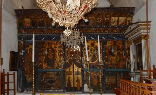 Έχει ξυλόγλυπτο τέμπλο με εικόνες του κρητικού ιερέα ζωγράφου, Εμμανουήλ Σκορδίλη και έναν πολύ ωραίο σταυρό.