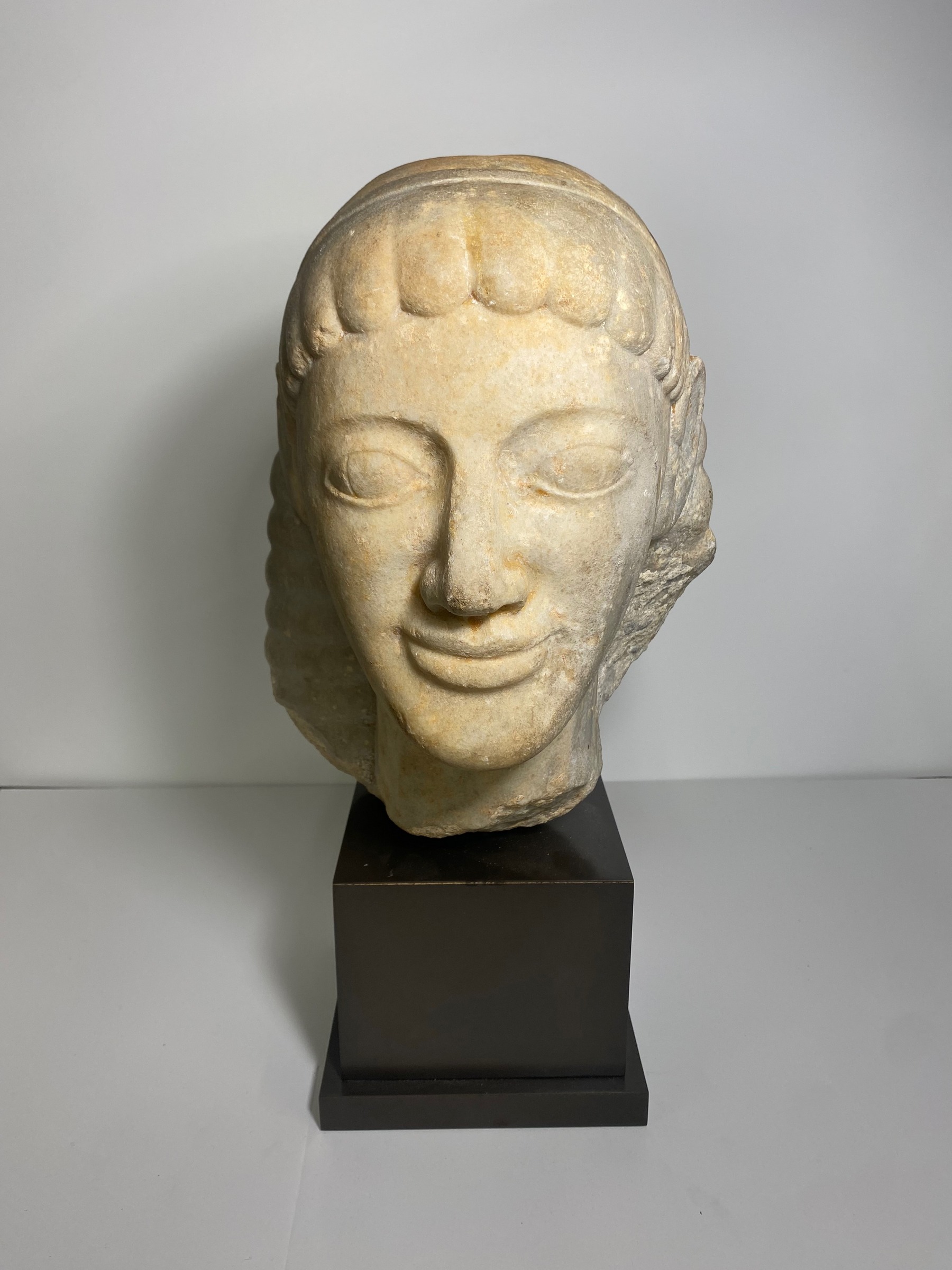 Μαρμάρινη κεφαλή κούρου. Ύψος 30 εκ. Περί τα μέσα του 6ου αι. π.Χ.