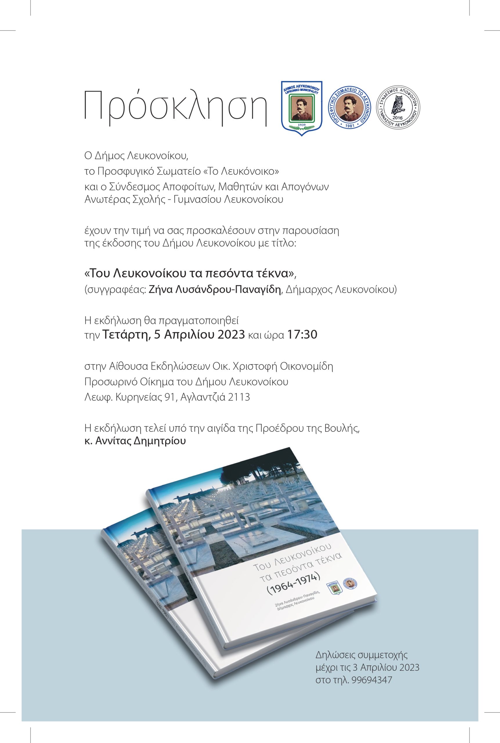 Η εκδήλωση θα πραγματοποιηθεί την Τετάρτη, 5 Απριλίου 2023 και ώρα 17:30 στην Αίθουσα Εκδηλώσεων Οικ. Χριστοφή Οικονομίδη Προσωρινό Οίκημα του Δήμου Λευκονοίκου Λεωφ. Κυρηνείας 91, Αγλαντζιά 2113
